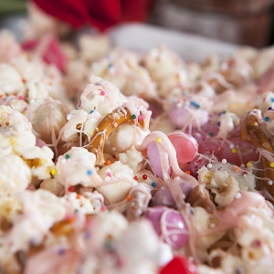 Place pretzels, Mother’s cookies, M&Ms and Mike and Ike candies into a large bowl with popcorn. Pour half the melted chocolate over the popcorn mixture and combine with a rubber spatula.